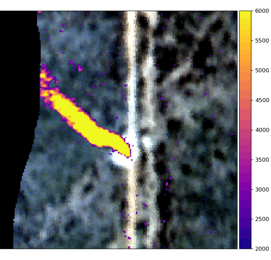 To demonstrate OSKs technology, we have executed the OSK processing chain on data collected from one of our airborne campaigns using the “Kato” sensor, which typically has a resolution of around 0.5 meters. Additionally, we have remapped the airborne data to approximate the upcoming Ghost sensor specifications, by convolving with an approximate point spread function (PSF), resampling, and adjusting the SNR. In doing so, we demonstrate what a methane detection might look like in our satellite imagery, Figure 2. Additionally, processing the remapped data allows us to validate our processing and quickly deploy algorithms to the Ghost sensors. Actual detections from the Ghost 2 sensor using these same algorithms are shown in Figure 3 for comparison.